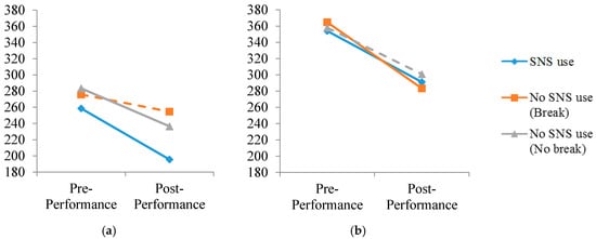For the performance of the simple task, the performance of the SNS use group was significantly better than those of the no SNS use groups, thereby supporting Hypothesis 3. On the contrary, for the performance of the complex task, the performance of the SNS use group was not statistically different from that of the no SNS use groups. Therefore, Hypothesis 4 is also supported. Figure 3 summarizes pre- and post-performances of each group. The performance of all groups improved as time went by. However, the performance improvements of no SNS use and break group on simple task and the no SNS use and no break group on complex task were not statistically significant (see dotted lines in Figure 3).