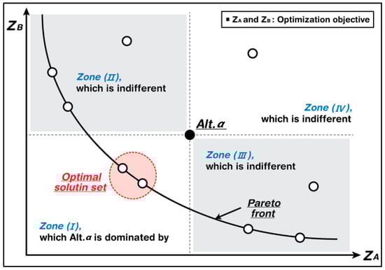 Figure 5. The concept of the Pareto front and the optimal solution set.