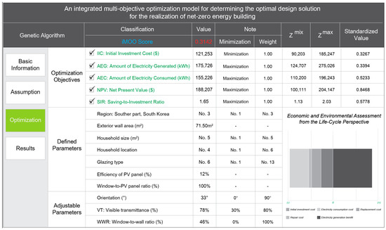 Figure 6. Graphical user interface for an integrated multi-objective optimization (iMOO) model for determining the optimal design solution for the realization of nZEB.