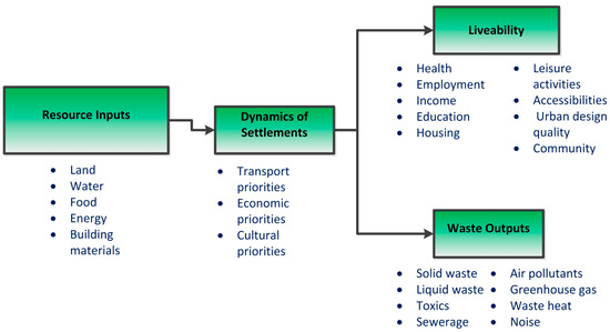 The model views cities as systems that require inputs of key resources that are drawn into the urban processes, which then convert them into waste through metabolism, as in all living systems, but also into anticipated liveability outputs. Newman argues that “…cities are more than a mechanism for processing resources and producing waste; they are about creating human opportunity” [14]. Therefore, to achieve sustainability, urban planners should not only aim to reduce material and energy flows (inputs and waste outputs) but also to increase the liveability of the city, which is understood as an increase in social amenity, health, and well-being of citizens. This covers the whole gamut of socio-economic outcomes being sought in cities.