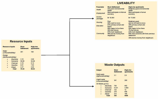 The Extended Metabolism Model was selected as an analytical framework because it enables us to study the metabolism and liveability of slums combined, while the other metabolism models focused only on inflows and outflows of resources. This model has been applied previously by Alma Arief [43] as a framework to integrate economic, social, and environmental goals in slum dwellers living along the Ciliwung River in Jakarta, Indonesia [15]. Its application to the slums of Addis Ababa was based on the model’s indicators set out in Table 3. Only the indicators provided were possible to be measured in the slums of Addis Ababa.