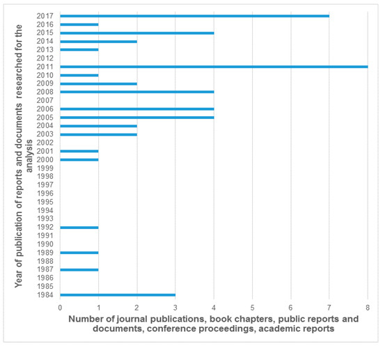 The literature accessed was diverse and included journal papers published in the period 2000–2017; books (or chapters in books) published between 1987 and 2017; and online documents (government bills, regulations and official reports, industrial publications or conference proceedings) dating from 1984 to 2017. While Google Scholar was the repository accessed for the government reports and industrial publications (along with the list of References in Kjeang [1989]—a book authored by the first author of the present paper), Science direct was the database referred to for the peer-reviewed journal publications. About 18 scientific journal publications highly relevant to the current study (focusing on Sweden and/or energy advising) were shortlisted for review. In addition to journal papers, about 13 books/compendiums of conference proceedings/academic reports were also useful sources of information for this historical analysis. Among the keywords used to extract publications of relevance were “energy advising”, “energy consulting” and “energy advice”. The keyword “energy advice” yielded the highest number of matches among all the keywords used for the search. The figure below charts the year of publication for the documents analyzed.