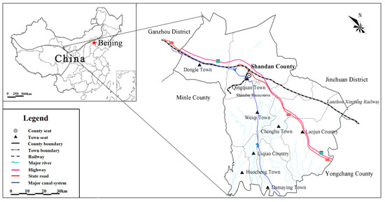 Shandan County is located in the middle of the Hexi Corridor and is the eastern “gate” of Zhangye City in Gansu Province of China. Shandan County is often known as “the wasp-waist of corridor” and “the throat of Ganliang”. In fact, the ancient “Silk Road” passes this area. Shandan County is bounded by Yongchang County in the east, Minle County in the west, Ganzhou District in the northwest, the Huangcheng District of Sunan Yugur Autonomous County in the southeast, the Lenglong mountain range of the Qilian Mountains and Qinghai Province in the south and Longshou Mountain in the north. The other side of Longshou Mountain is Alashan Right Banner in the Inner Mongolia Autonomous Region. Shandan County is a typical oasis. It has a total area of 5402.43 km2, a north-south length of 136 km and an east-west width of 89 km. It is in 100°41′–100°42′E and 37°56′–39°03′N (Figure 1). This area has an alpine semi-arid climate, with uneven distribution of seasons, strong solar radiation, long sunshine hours, low temperature, large temperature difference between day and night, little but concentrated rainfall, high evaporation, low humidity and short frost-free period. The mean annual temperature is about 6.5 °C, the mean annual precipitation is 199.4 mm, sunshine hour is 2964.7 h, evaporation is 2351.2 mm and the frost-free period is 165 d. Its altitude ranges from 1549 to 4444 m above the sea level. The highest point is in the Lenglong mountain range of Qilian Mountains. The lowest point is in Xitun Shahe of Dongle County. There are the Maying river, Huocheng river, Sigou river and Shandan river in Shandan County. In addition, there are many ditches such as Liushui Kou, Ciyao Kou, Nanshan Kou.