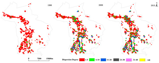 Using 1 km × 1 km grids, we obtained the dispersion degree of rural settlements in 1998, 2008 and 2015 (Table 4 and Figure 3). In general, the dispersion degree of rural settlements increased from 1998 to 2008 and tended to be stable after 2008. The number of grids with rural settlements increased from 538 in 1998 to 727 in 2009 (by 35.13%) and increased by only 3.3% from 2008 to 2015. In 1998, the proportion of grids in which the dispersion degree of rural settlements is lower than 10 was 99.63% and decreased to 87.62% in 2008. Consequently, the proportion of grids in which the dispersion degree was higher than 10 increased by 12.02% from 1998 to 2008. In addition, the number of grids in which the dispersion degree is in the range of 0–5 decreased slightly (by 4.09%) from 1998 to 2008. However, the proportion of such grids decreased significantly, from 95.35% in 1998 to 67.68% in 2008. The number and proportion of grids in which the dispersion degree was higher than 6 increased. Especially, the number and proportion of grids in which the dispersion degree was in the range of 6–10 increased the most significantly, from 23 and 4.28% in 1998 to 145 and 19.94% in 2008. According to the field investigation results, the dispersion degree of rural settlements increased is caused by the formation of solo settlements (≤0.1 hm2) and small settlements as well as the division of large settlements into smaller ones. Thus, rural settlements tend to be more dispersed.