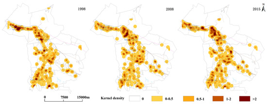 - In 2008 and 2015, the number of regions with kernel density in the range of 0–2 patches/km2 increased obviously compared with that in 1998and their distribution tended to be more dispersed.