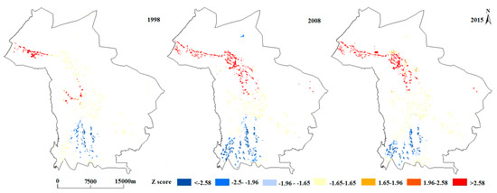 Distribution of hotspots and coldspots in Shandan County in 1998, 2008and 2015. Each point represents the centroid of a rural settlement patch and its color represents the Z score. Red zone denotes hotspot zone. The deepness of color represents statistical significance. Blue zone denotes cold spot zone. Yellow zone denotes zone where settlements randomly distributed.