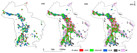 Distribution of grids with different K values in Shandan County in 1998, 2008 and 2015.