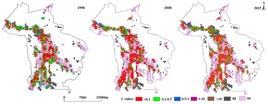 Grids with different L values in Shandan County in 1998, 2008 and 2015.