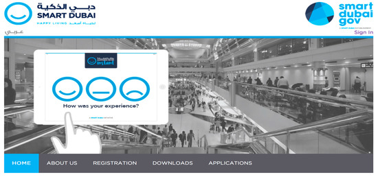 The Happiness Meter Index measures the level of satisfaction at the highest level. It is a city-wide happiness meter launched across all government entities, with online and offline interfaces [58]. Measurement is processed through smart (online) devices installed at the headquarters of government organizations and connected to the central database that monitors performance on a real-time basis. Timely system generated reports are sent to decision makers which effectively form the basis of control systems. Through this process, areas and functions that meet or exceed happiness related performance objectives, as well as those that do not, are identified. For instance, in 2016 alone, one million interactions with the public were gathered across 31 government entities which formed the basis to monitor and track public services and outcomes. Currently, the happiness portal measures various services to residents as well as visitors (see Figure 1).