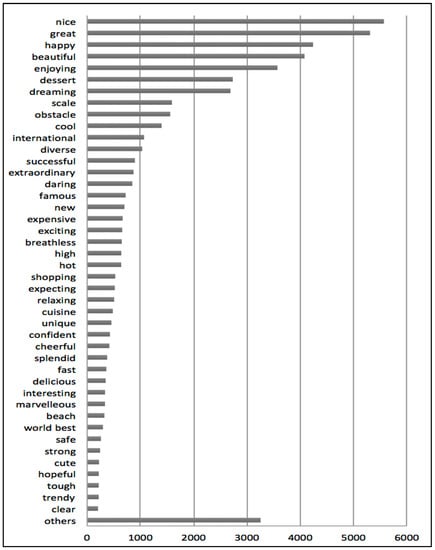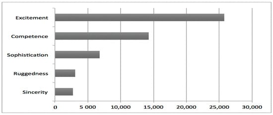 Following Aaker’s five dimensions, it was found that the excitement dimension had the highest frequency (25,758), and competency the second highest (14,268). The lowest frequency relates to the sincerity dimension (see Figure 1). In regards to each individual trait, “nice” is the most frequently used word appearing 5569 times, followed by “great” (5309), “happy” (4239), “beautiful” (4079), and “enjoy” (3571) in terms of frequency (see Figure 3, as well as Figure 4 and Figure 5 for the result by individual trait).