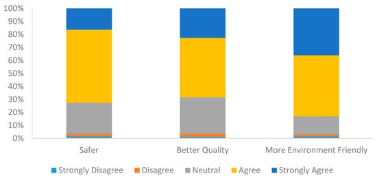 Determining consumer perception of rice–fish system rice is essential to identify the drive underlying the WTP for rice from the rice–fish system. In the survey, respondents were asked whether they perceived rice from the rice–fish system as safer, of better quality, and more environmentally friendly through a five-point Likert scale (We let respondents to statements “I believe that rice from the rice-fish system is safer/better quality/more environmental friendly”. The answers range from “strongly disagree” to “strongly agree” with a five-point Likert scale).