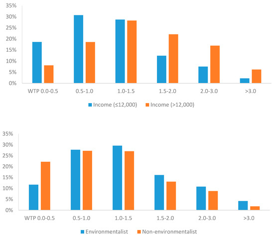 Figure 2 presents the frequency of the respondents’ choices in CV question. Note that consumers seldom selected the price of “6 yuan or above” for rice from the rice–fish system. It indicates that consumers, in general, are very conservative and not willing to pay a premium of more than 100% for rice–fish system rice in China. The results (p-value = 0.043) also show that the consumers with high income (income > 12,000) were more likely to pay a higher premium for rice from the rice–fish system than those with low income (income ≤ 12,000). Not surprisingly, the respondents who agree or strongly agree with the statement “I am an environmentalist” were more likely to pay a higher premium for rice from the rice–fish system (p-value = 0.000).