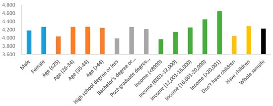 Figure 3 reports the statistics of respondents’ mean WTP for rice from the rice–fish system by socio-demographic characteristic. Because the CV questions presented a set of price intervals for respondents to select from, the means of WTP are assumed as the middle point of the interval (for example, if a respondent choose the interval 3.0–3.5, so the midpoint is 3.25. As for the open interval, it is equal to the lower boundary 6.0 and the half distance of the neighboring interval 0.5). Respondents on average are willing to pay a 41% premium for rice from the rice–fish system over conventional rice. In addition, females, those aged 35–44, those with high family income, and those with a bachelor’s or associate degree were willing to pay more for rice from the rice–fish system.