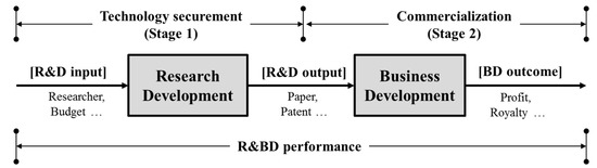 However, the above-mentioned studies on DEA-based R&D and R&BD performance evaluation have a limitation in that they did not consider the economic value that the technology transfer created and business development (BD) (which refers to commercialization), which is the ultimate goal of R&D. Rather, the studies focused primarily on visible outputs such as patents and papers in evaluating R&D performance (Jeon and Lee [11]). Sexton et al. [12] mentioned that the entire period’s evaluation, from the R&D to the BD phase, is very much required for R&D performance evaluation, and Bozeman et al. [13] emphasized that R&D performance measurement may be extended to include technology transfer and BD owing to their significance and the demand for them. In particular, Min [14] mentioned that the stabilization of a BD system is quite important due to limited R&D resources, and therefore, BD performance evaluation, including R&D results, is essential when considering the overall R&D process from research to commercialization. Commercialization in R&D is defined as the activities that develop and procure new technologies and launch a new business to make products and/or charge engineering fees; this entire process is the so-called R&BD.