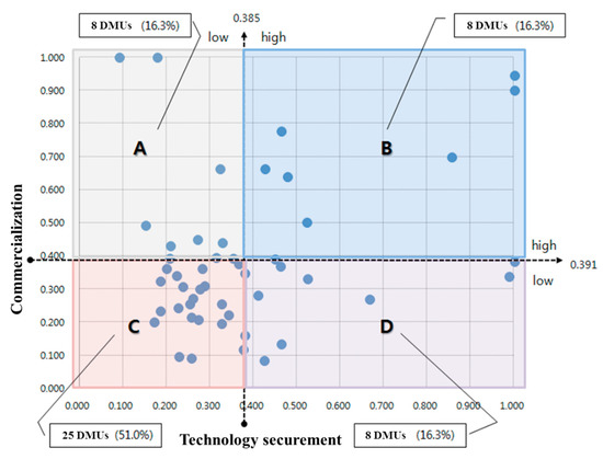Figure 3 shows the DMUs located on a two-dimensional plane with two axes according to their technology securement and commercialization performances. DMUs were classified as high and low based on the average performances in the technology securement and commercialization stages (the average performance scores of the technology securement and commercialization stages for x axis and y axis were 0.385 and 0.391, respectively). The A area is a set of DMUs with relatively high performances in the commercialization and relatively low performances in technology securement. The B area is a set of DMUs with high performances in both technology securement and commercialization. The C area is a set of DMUs with low performances in both technology securement and commercialization. The D area is a set of DMUs with relatively high performances in technology securement and relatively low performances in commercialization. Only eight DMUs (16.3% of the total DMUs) had performance scores greater than the average in both the technology securement and commercialization stages, and 25 DMUs (51% of the total DMUs) had performance scores less than the average in both the technology securement and commercialization stages. In other words, more than 50% of the DMUs fall into the underperforming group, which has relatively low performances in both technology securement and commercialization. If DMUs in the A area try to improve their technology securement performances first, their R&DB performance can improve effectively. In contrast, the DMUs in the D area can improve their R&DB performance effectively by focusing on improving their commercialization performance.