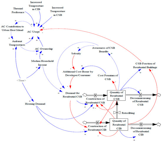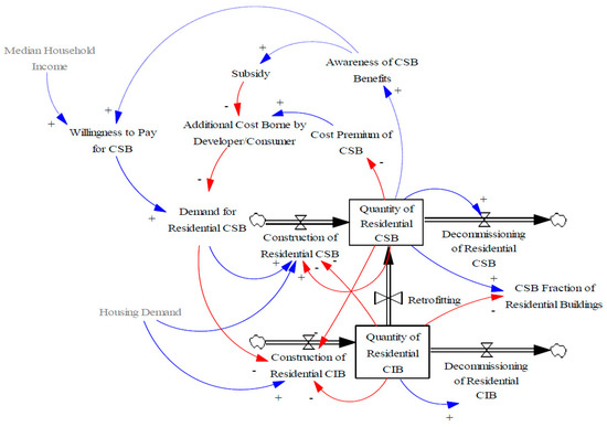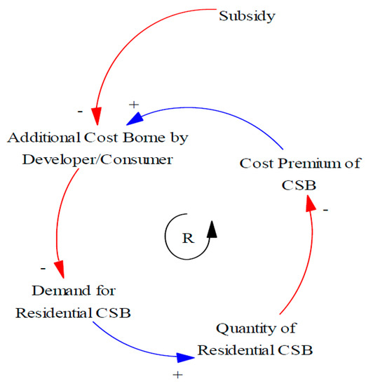 The cost premium of green buildings decreases as the green building market matures [34] due to learning effects, economies of scale and development of supporting infrastructure and supply chains. This is known as the experience curve and can be described as a reinforcing loop. As residential CSB are constructed, industry experience, logistical chains and economies of scale reduce the “Cost Premium of CSB” relative to conventional residential buildings, in turn reducing the “Additional Cost Borne by Developers and/or Consumers.” This increases the “Demand for Residential CSB”, leading to further construction, increasing the “Quantity of CSB” (Figure 1). A “Subsidy” to reduce the costs experienced by developers and consumers could accelerate this feedback loop.