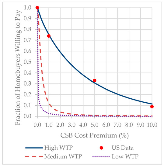 Taking advantage of the experience curve requires sufficient demand for CSB. This in turn requires homebuyers with “Willingness to Pay for CSB” that matches existing cost premiums. WTP for green buildings is influenced by several factors including income [53] and exposure to green buildings (“Awareness of CSB Benefits”) [54]; the latter forms a potentially important feedback loop. Unfortunately, there is a lack of Malaysian data on WTP and motivating factors for residential green buildings. In lieu of attempting to construct WTP for CSB from household income and exposure to green buildings, WTP curves from other countries were used, with widely differing curves selected to explore a broad range of possible outcomes.