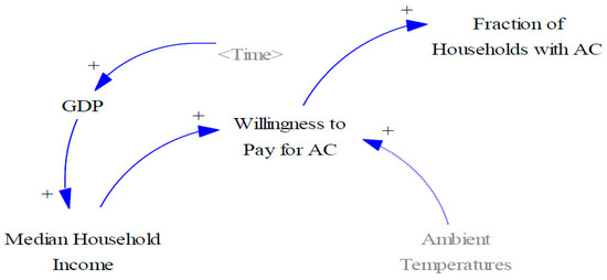 Although both AC and CSB are solutions for indoor thermal comfort, consumer considerations in WTP for these goods are very different. We are not aware of any evidence showing that non-AC thermal comfort is a substantial factor in WTP for residential buildings. There is, however, a strong latent demand for AC in warm climates, with median household income constraining ownership levels [1,2]. As “GDP” and “Median Household Income” grow, societal perceptions of AC in warm climates change quickly, from a luxury good to a necessity and “Willingness to Pay for AC” increases. These relationships are reflected in Figure 5.