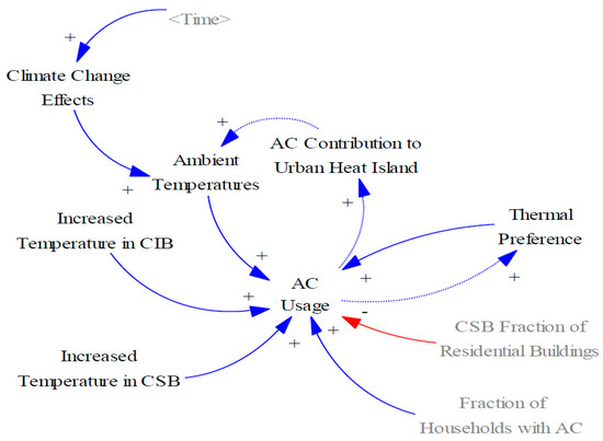 The uptake of CSB and AC are key determinants of future “AC Usage” in Malaysia (Figure 6). “Thermal Preference,” “Climate Change Effects” that increase “Ambient Temperatures,” and elevated indoor temperatures (Increased Temperature in CSB/CIB”) are the other driving factors simulated in the model. The “AC Contribution to the Urban Heat Island” creates a potentially feedback loop but is omitted from the simulation as the time scale of the UHI effect (hours) is not compatible with the time steps used in the simulation (years).