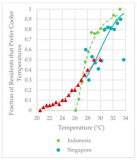 Fraction of residents preferring cooler temperatures for a range of ambient temperatures in Singapore, Indonesia and Central Southern China. Data points are taken from references [72,73,74]. Curves were fitted to data using four or five parameter logistic equations.