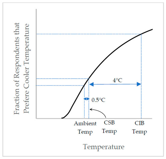 Night-time indoor temperatures are an important factor for AC usage in Malaysian residences. Indeed, a survey in Johor Bahru shows that AC usage is heavily weighted toward evening/night hours, peaking at 11 p.m. (80% of AC owners using AC), while day-time use is much lower (10% of AC owners using AC), even though 70% of residences are occupied during the day [24]. Most Malaysians do not use window ventilation at night, resulting in indoor temperatures being 4 °C warmer than outdoor ambient temperatures (Increased Temperature in CIB); this gap is reduced to 2.5 °C with window ventilation and to 0.5 °C when effective mechanical ventilation is also employed [25]. It was assumed that CSB design can at least match this performance (Increased Temperature in CSB). This shifts indoor temperatures toward the left of thermal preference curves, reducing the demand for cooler temperatures and AC usage, illustrated in Figure 8.