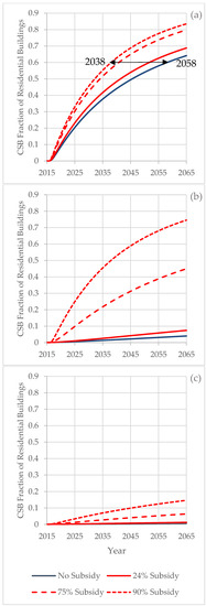 The simple model presented here does not capture a range of other factors that influence CSB uptake. Various simplifying assumptions were used, many of which are captured in some way in the scenarios or sensitivity analysis carried out: (1) That the cost premium, progress ratio and WTP for green buildings are good proxies for CSB, whereas the cost of key features in CSB design and construction may differ from cost of features most widely adopted in green buildings. This assumption was necessary as a starting point due to a lack of CSB data; these three factors are closely examined in scenarios and sensitivity analysis; (2) That subsidies are efficient at reducing the cost premium to homebuyers, whereas some of this funding may in fact be captured by home builders [76]. This would reduce subsidy effects, which would be reflected in the different subsidy cases examined; (3) That the cost premium of CSB and consumer WTP is same across all market segments, whereas demand for green buildings and WTP is positively correlated with income [53,77,78] and the cost premium to achieve CSB standards may be greater for the low-end market segment. We might expect slower uptake than predicted by the model if this assumption is not true and possible step-like delay behavior if different market segments behave substantially differently; it is difficult to estimate the magnitude of this effect; (4) That green/CSB building uptake in the commercial and industrial sectors do not substantially reduce cost premiums in the residential sector. We expect the benefit, if any, to be small, as the majority of green building projects are commercial or industrial and this has not appeared to spur a similar magnitude of green residential uptake; (5) That information asymmetry between home builders and homebuyers is not substantive and that CSB supply would match demand without delay. Depending on the level of information asymmetry, it is possible that home builders never enter the market; however, one function of subsidies is to reduce the perceived risks for home builders; (6) That the WTP curve for CSB remains the same over time. This is explored in limited ways by the different WTP curves; however, it is a critical variable and has large impacts on the system behavior.
