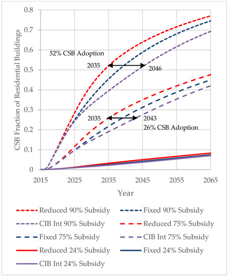 In the High WTP case, the cost premium of CSB drops rapidly and plateaus around 1.3% with or without subsidies. At this point, CSB represents 70% of all new residential construction before subsidy effects are factored in. Nonetheless, subsidies can still play a large role in accelerating CSB uptake: at the 75% subsidy level, CSB represents 60% of all residential buildings in 2038, 20 years ahead of the no-subsidy scenario. Thus, it is possible to use subsidies to accelerate short-term uptake of CSB and reduce or remove those subsidies as target CSB market penetration is achieved. Alternatively, subsidies can be maintained if the target representation for CSB among residential buildings is greater than 70%.