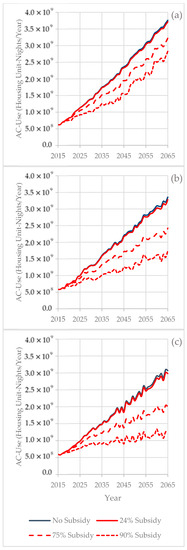 Subsidy effects on Malaysian residential night-time air-conditioning usage under various climate change scenarios: (a) A1FI (high ambient temperature increase), (b) A1B (medium ambient temperature increase), (c) B1 (low ambient temperature increase). Short-term fluctuations in AC usage are due to year-to-year climate variances.