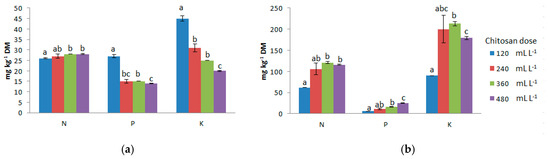 Total N content of solid fractions was increased (p < 0.05) only when the two highest doses were applied to the co-digestate (Figure 1). The highest P (27 mg kg−1 DM) and K content (45 mg kg−1 DM) were observed in a solid fraction when the lowest dose of chitosan was applied. In liquids, only the highest two dose levels increased (p < 0.05) total N, P and K contents as chitosan doses increased (Figure 1). Retention of K in solid fraction followed a similar pattern as that of total P after chitosan addition and gravity drainage (Figure 1). The simple separation indices (Et) averaged 35.9%, 40.2%, 75.4%, 95.6%, and 96.2% for N, P, K, Cu, and Zn, respectively.