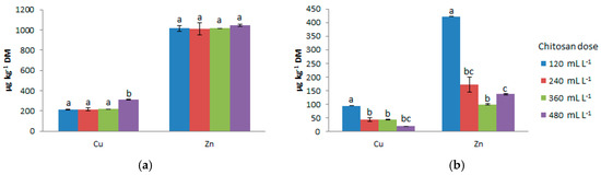 The content of Cu and Zn in the produced solids rose as chitosan doses increased. However, only at the highest chitosan dose did Cu content achieve significance (p < 0.05) (Figure 2). Alternatively, in the case of the liquid fractions, the content of these two metals was below (p < 0.05) the level in the co-digestate, and decreased as chitosan doses increased (Figure 2).