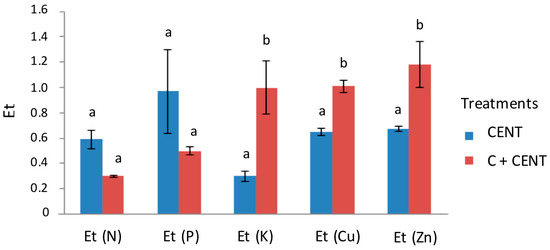 Simple separation indices (Et) calculated for nutrients and metals for two treatments denoted as CENT (centrifugation) and C+CENT (chitosan addition followed by centrifugation). Means (n = 3) within each nutrient and trace metal Simple separation index followed by different letters differ significantly from each other (p < 0.05).