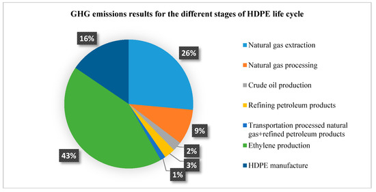 Greenhouse gas (GHG) emissions results for the different stages of HDPE production.