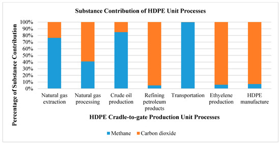 In Figure 2, we can see the substance contribution to GHG emissions under each unit process. Methane appears to be the largest contributor to GHG emissions in natural gas extraction and crude oil extraction with respectively 76.4% and 85% of total CO2e. In addition, methane is responsible for 99.9% of total GHG emissions in transportation. However, for natural gas processing, refining petroleum products, ethylene production and HDPE manufacture, carbon dioxide dominates with a higher percentage of GHG emissions.