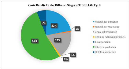 Based on Figure 4, we can see that the HDPE producer has the largest costs along the life cycle of HDPE, with the raw materials costs responsible for approximately 84% of these costs. In addition, by looking at the results by cost category, we can see that the raw materials costs are responsible for the largest percentage of total costs along the cradle-to-gate life cycle of HDPE.