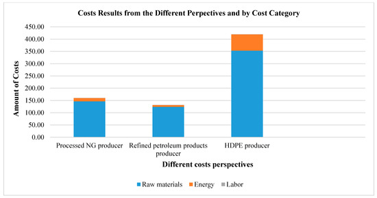 The LCC results can also be presented from the different perspectives taken into account along the HDPE life cycle and by cost category (See Figure 4 below). Figure 4 presents the costs from the perspective of the producer of processed natural gas, producer of refined petroleum product and producer of HDPE (while considering that the transportation is paid by the producer of HDPE). As well, Figure 4 presents the results by cost category, raw materials, energy and labor costs.