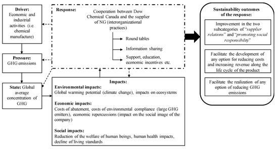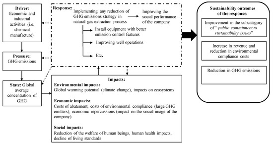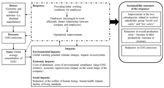 Table 3 is explained further by presenting schematic examples for some cause-effect relationships that could be established between the three dimensions of sustainability that will be used in developing sustainability improvement proposals. The schematic examples are presented using the DPSIR framework. The DPSIR established by the European Environment Agency (EEA) is used in this work for environmental analyses and to present the sustainability recommendations proposed to be undertaken by the companies responsible for the production of HDPE. The DPSIR is a systematic framework for structuring the cause-effect relationships in connection with environmental problems [31,32]. It takes into account the interacting components of economic, social and environmental systems. The scheme helps to provide an overview of the environmental problems while connecting their origin to the results and developing the efficient responses that could participate in resolving the problems [31,32]. While DPSIR mainly focuses on the environmental impacts of socio-economic development [31], in this work we take into account all effects from the three dimensions of sustainability to facilitate the development of sustainability solutions and responses. The DPSIR schematic examples provided in this section show how the responses proposed to be undertaken by the companies are crafted to minimize the un-sustainability impacts of the drivers and pressures on ecosystems, while maximizing the welfare of human beings (companies’ stakeholders in this study) and reducing the companies’ economic costs. The schematic examples presented below extend the DPSIR model to present the sustainability outcomes of the responses proposed. To build the schematic examples in Figure 5, Figure 6, Figure 7 and Figure 8, and specifically present the sustainability responses with their outcomes on the three dimensions of sustainability, we looked at the potential connections that exist between the potential GHG reduction opportunities in Table 2 and the social subcategories that require improvements in foreground and background processes in Table 1. In addition, in building these connections, we have done analysis based on previous studies (e.g., [9,33,34,35]) related to corporate sustainability performance and life cycle approaches and supported it with plausible arguments. The schematic examples of the sustainability improvement proposals in Figure 5, Figure 6, Figure 7 and Figure 8 are explained in details as follows by identifying the process used to determine the sustainability measures and outcomes.