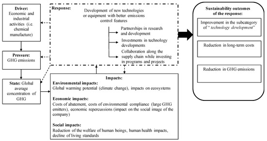 Figure 8 presents the DPSIR framework for the problem of climate change and GHG emissions with the sustainability response proposed and its outcomes on the three dimensions.