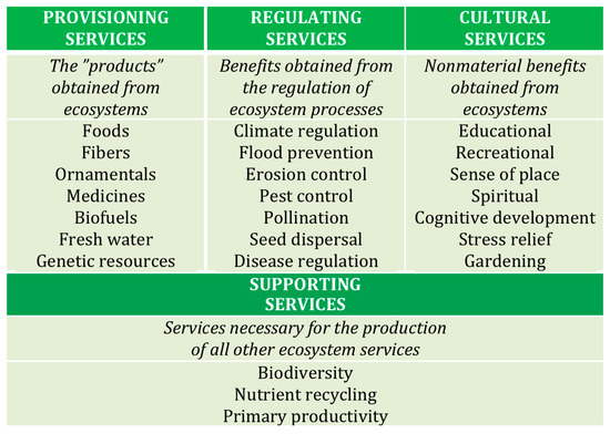 Ecosystem services include provisioning services, regulating services, cultural services and supporting services (Source: Millenium Ecosystem Assesment. Ecosystems Human Well-Being: Synthesis; Island Press: Washington, DC, USA, 2005).