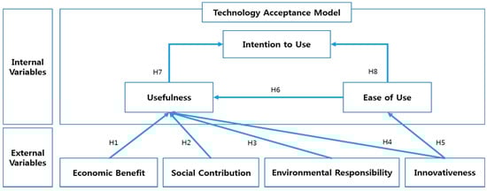In the meantime, many studies have been conducted on the factors influencing the acceptance of new products or the direction of new technology development. These studies are applied to identify factors that determine consumer behavior in social psychology or to evaluate consumer acceptance of new information and technology. These research methods include the Theory of Reasoned Action (TRA), the Theory of Planned Behavior (TPB), and the Technology Acceptance Model (TAM). TAM, introduced by Davis [15], is a model applied to examine consumer acceptance of information technology, and is a model for assessing the effects of perceived usefulness and ease of use on consumers’ intention to accept [16]. Therefore, TAM is widely used for information technology acceptance and for empirical studies to grasp consumers’ willingness to accept new products.