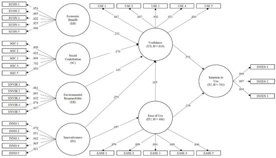 The results for the hypothesis of the research model are shown in Figure 2. As shown in the figure, economic benefits, social contribution, environmental responsibility, and innovation acceptance tend to have a positive impact on usefulness, and innovation acceptance has a positive effect on ease of use. In addition, ease of use has a positive effect on usefulness, and both usefulness and ease of use have positive effects on acceptance intention. As shown in Table 5, all hypotheses are significant (p < 0.01).