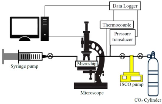 The micromodel is horizontally placed on adjustable jack stages. A precise syringe pump (Kats Scientific, NE-1010, Kats Enterprises, Denton, TX, USA) controlling a high-pressure steel syringe (KD Scientific, 2.5 mL) is used to drain and inject water into the micromodel. The stainless-steel syringe is connected to one side of micromodel with a transparent tubing. The high-pressure transparent tubing is used to observe the interface between CO2 and water. On the other side, the micromodel is connected to a precise-high-pressure ISCO pump (500 HP, Teledyne ISCO, NE, USA) by another transparent tubing. A digital camera records a video during fluid injection into the micromodel. Pressure and temperature data are collected by an OMEGA PX309-3kGV pressure transducer (having 20 MPa capacity and accuracy of 0.25%) and a T-type (Copper/Constantan, OMEGA, Norwalk, CT, USA) thermocouple (OMEGA, Norwalk, CT, USA), respectively. The sensor information is recorded using a data logger.