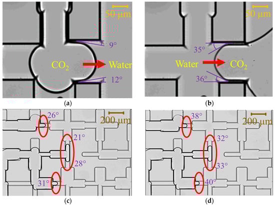 Figure 2 shows how the RCA and ACA in the micromodel are measured in same channel. When CO2 displaces water in the micromodel, receding contact angles are observed (Figure 2a). When water displaces CO2, advancing contact angles are measured (Figure 2b). Images are captured while the interface had motion. Pore throat size is 127 μm in Figure 2a. Results show that the advancing contact angle is considerably higher than the receding contact angle in the same pore throat, consistent with previous studies [18,22,43,44,45]. The difference between ACA and RCA is attributed to the blemishes on non-ideal surfaces which results in pinning the interfaces to the solid surface [46]. Various RCAs and ACAs at throat size of 47 μm in the micromodel are also shown in Figure 2c,d, respectively.