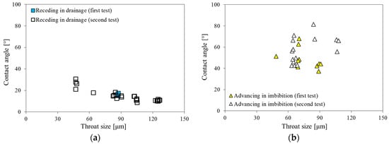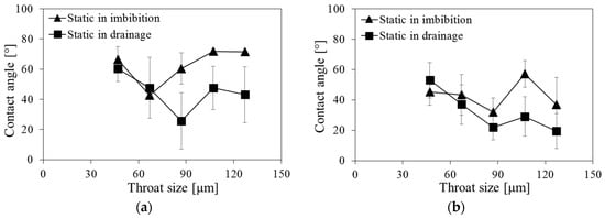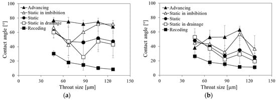 Range of contact angle values according to various pore throat sizes. (a) At pressure of one megapascal; (b) At pressure of eight megapascals.