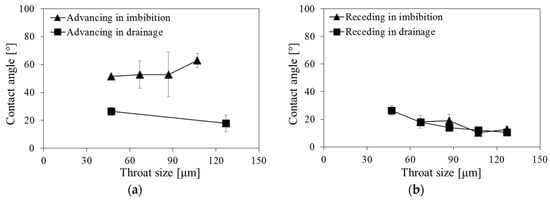 Figure 7 shows the average and standard deviation of all contact angles (RCA, ACA, and SCA) measured in this study. These results show that SCA, RCA, and ACA have high discrepancies at each pore throat size, consistent with previous studies [38,40,47]. Contact angles measured using micro-CT with rock cores and beads packs also have a wide range of values due to hysteresis of contact angle, exposure time, complex geometry, and physical and chemical heterogeneity of the surface [38,40,47].