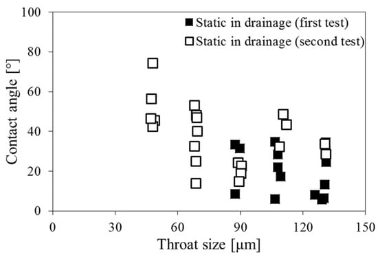 Static and equilibrium contact angles. Thermodynamically, the equilibrium contact angle (ECA) can only be measured at a global minimum free energy configuration, while the static contact angle (SCA) can be measured at any kinetically stable condition between advancing and receding configuration, which can be considered as a meta-stable equilibrium configuration [49]. In our micromodel, interface movement is stopped in two situations. First, before percolation of the fluids (CO2 or water) into the micromodel (percolation occurs when the front of injected fluids reaches to the other side of the micromodel), some interfaces stop at smaller pore throats due to higher capillary pressure. Second, after percolation, because almost all the injected fluid passes through the percolation path, other interfaces remain motionless. In any of these situations, static contact angles (SCA) could be measured with the motionless interfaces. However, the system of the micromodel is under fluid (water or CO2) injection continuously. Thus, the motionless interfaces are not allowed to rest and completely approach ECA. This is the reason for low reproducibility of SCA presented in Figure 5. Because of different level of relaxation of the interfaces, various mode of interfaces before stoppage (i.e., receding or advancing), and pinning effect originated from solid surface imperfection, SCA shows wide range of values for the two different tests and also for each test in any throat sizes. The range of SCA at each pore throat size is higher than that of equilibrium contact angle (ECA) measured with CO2 or water droplet on flat surface (i.e., 8° to 45° on silica or glass surface) [18,22,43,50,51,52].