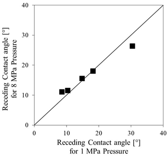 Receding contact angle at pressure of eight megapascals vs. that at pressure of one megapascal.