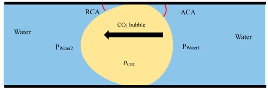 where Pcapillary1 is the capillary pressure in the right water–CO2 interface, Pcapillary2 is the capillary pressure in the left water–CO2 interface, is the pressure inside the CO2 bubble, Pwater1 is the water pressure in the right side (where water advances), and Pwater2 is the pressure in the left inside (where water recedes).