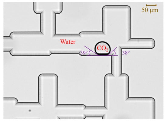 Capillary or residual trapping. In capillary or residual trapping, CO2 bubbles are entrapped inside rock pores by three mechanisms: (1) snap-off, (2) dead-end, and (3) by-passing. In snap-off, when water is invaded into a water-wet media, the water in the corner of a throat will swell gradually until it disconnects the non-wetting phase in the throat and forcibly pushes non-wetting into pore bodies [60,61]. The snap-off trapping mechanism is dominant for water-wet rocks with a high aspect ratio of pore-body diameter to pore-throat diameter [62]. The snap-off mechanism starts when the non-wetting phase (CO2) fills the pore throat first. The water layer in the corner then swells by water injection until it completely separates the non-wetting phase (CO2) from the rock surface, similar to a bubble resting on a flat surface inside the micromodel as shown in Figure 11. In the dead-end, the non-wetting phase (CO2) is trapped in dead-end pores that it carries no flow. By-passing can be defined by a pore-doublet model. When two tubes with different sizes are branched and rejoined, non-wetting fluid is trapped in the larger tube. Thus, wetting phase by-passes the larger tube and passes through the smaller tube. For both dead-end and by-passing trapping mechanisms, the water-CO2 interface covers whole the pore throat. Thus, contact angles measured inside the micromodel can give more realistic values for numerical simulations compared with a contact angle of a bubble/droplet measured on a flat surface.