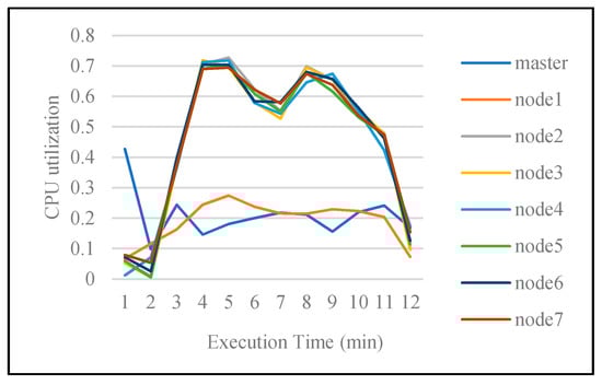 The CPU utilization of each node when the cluster has seven worker nodes and a master node.