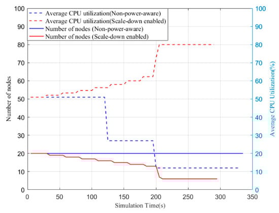 We compared the average CPU utilization, the execution time, and power consumption of the cluster by conducting experiments with the proposed algorithms. Figure 5 shows the average CPU utilization and the number of nodes in a cluster using the non-power-aware (default) method and the proposed scale-down algorithm. Notice that we do not present the number of nodes or the average CPU utilization of DVFS due to the fact that they are the same as the non-power-aware method. For the non-power-aware approach, the number of nodes remains unchanged during the simulation. Moreover, we can also see that the average CPU utilization decreases dramatically at around 125 s and 195 s when virtual machines with greater CPU capacity finish their tasks. By contrast, those nodes with less CPU utilization take longer to process the allocated jobs. The scale-down algorithm makes it possible to remove underutilized nodes, so the number of active nodes decreases steadily before 200 s. Similarly, a sharp drop appears at 200 s when the nodes complete their tasks. However, the average CPU utilization shows an opposite trend that increases stably. By moving jobs from less active nodes to more efficient nodes, the execution time is also reduced. Overall, the scale-down-enabled policy can improve the average CPU utilization of a cluster by removing underutilized nodes.